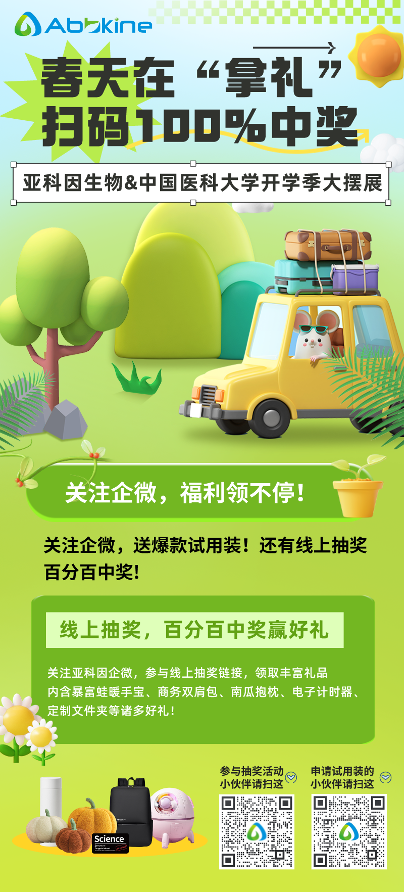 在校园展活动中,我们为现场同学们带来了亚科因一系列流量及爆款产品试用装推荐,有新品双萤光素酶报告基因检测试剂盒、EdU法细胞增殖成像分析试剂盒(绿色荧光)、一步法TUNEL细胞凋亡检测试剂盒(绿色荧光)、线粒体通透性转换孔(MPTP)检测试剂盒等爆款产品试用装,还有同学们常用的SuperKine™ 超敏型ECL发光液(飞克级)、SuperKine™ 增强型抗体稀释液、蛋白质定量试剂盒(BCA法)等流量产品试用装。同学们现场参与活动即可免费获得!